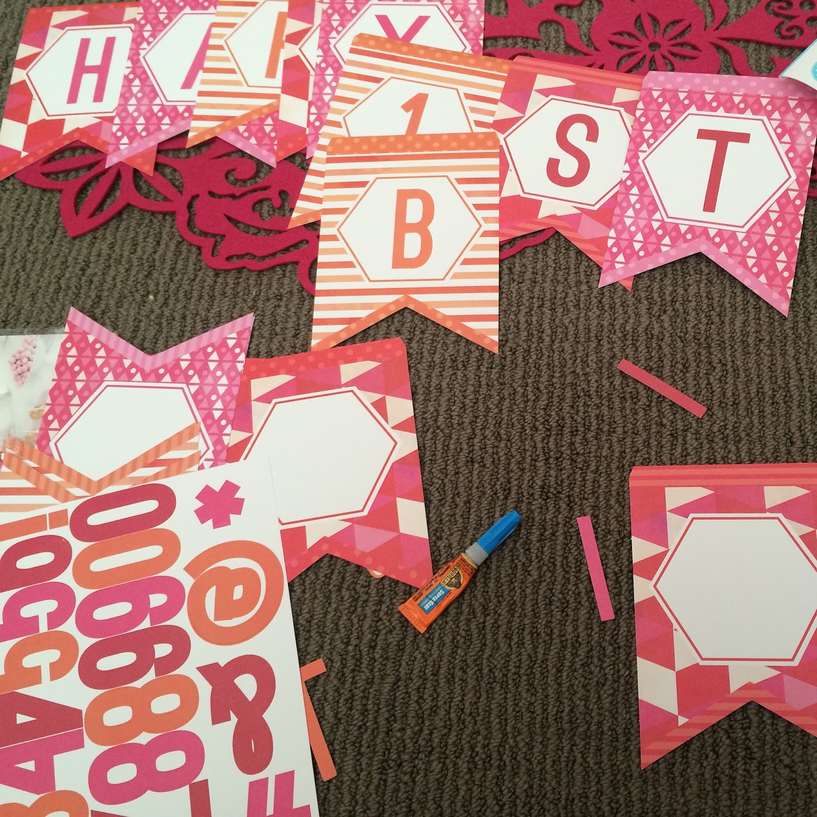 Next, I made a happy birthday manner. For the banner, I got really lucky and found a very cute colorful kit in a craft store. I glued letters onto pre-cut flags and assembled a banner using a white ribbon. The colors worked out perfect! I should advise you to look at Etsy for banners if you are planning a party, where you can find so many creative banners in any color you want at a very reasonable price...