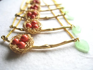 Tiny handmade bird nest with orange coral swarovski pearls hanging on a golden branch with a beautiful glass leaf. What could be a better way to bring spring into your step? This original bird nest neckalce design comes in silver and brass as well with any color of pearls and leaves you like to match your bridesmaid dresses or your spring outfits. Tell me your wedding colors for custom orders.